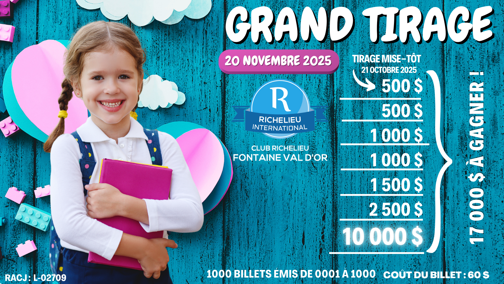 Participez à notre tirage annuel et soutenez notre engagement financier et social envers de précieux organismes de Val-d’Or tels que la Maison de la Source Gabriel, le Centre de bénévolat de la Vallée-de-l’Or, la Maison des jeunes l’Énergiteck et bien d’autres encore! Avec une chance sur 1000 de gagner, vos probabilités de succès sont bien meilleures qu’avec Loto-Québec.